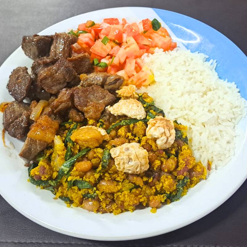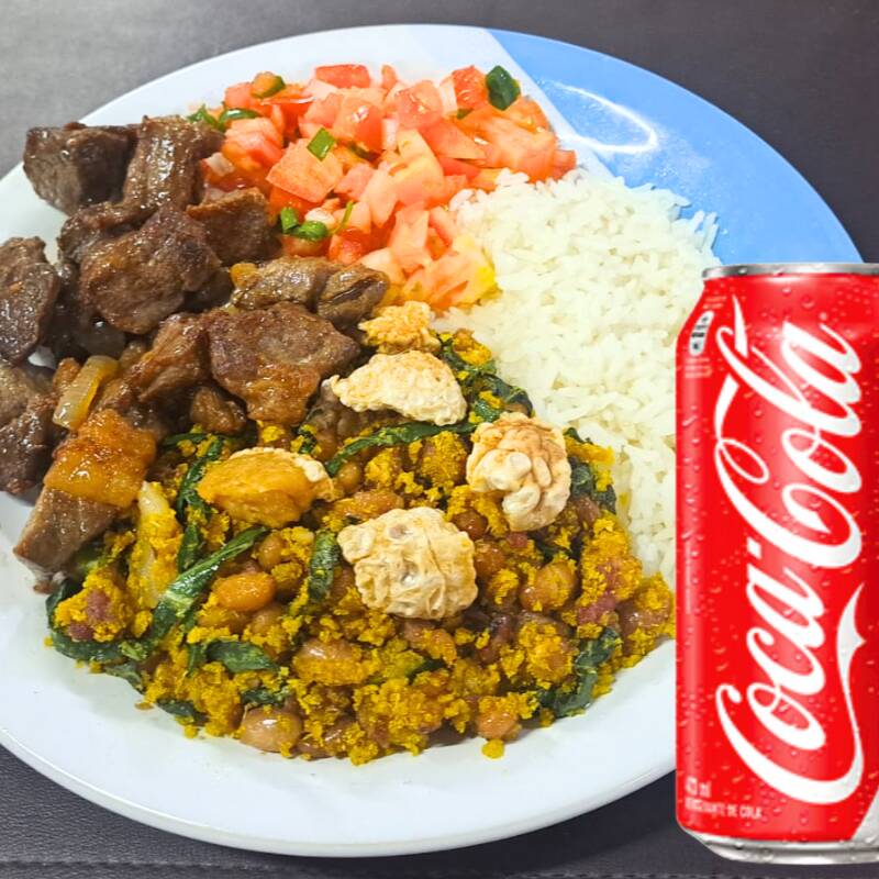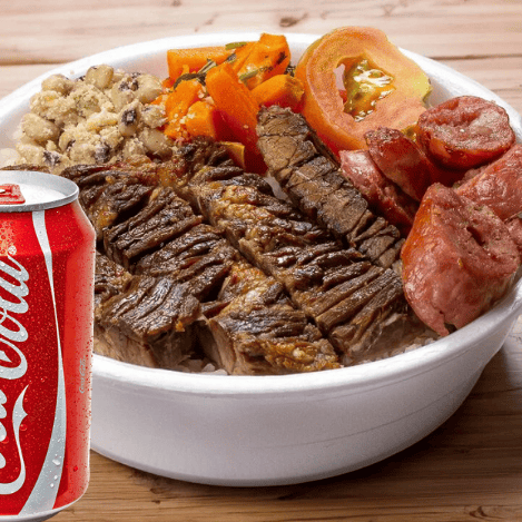Escolha Sua Carne com Arroz, Feijão Tropeiro, Salada e Coca-Cola 350ml: Uma Refeição Completa, Refrescante e Cheia de Sabor Para Quem Quer Almoçar Bem e Sem Complicação.