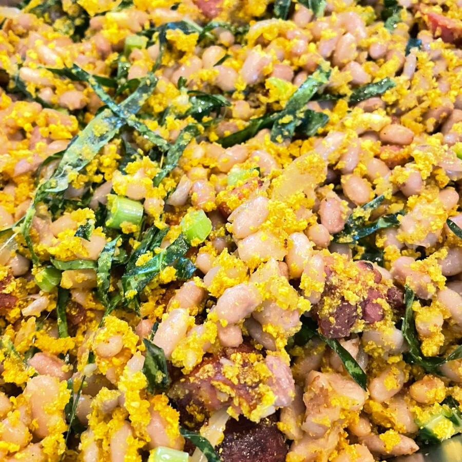 Marmita bem servida. Acompanha arroz, feijão tropeiro, e guarnições do dia e 2 tipos de carnes do churrasco.
