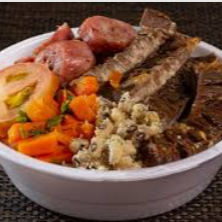 Marmita simples composta por arroz, feijão de caldo, macarrão, 1 opção e legumes cozidos, 1 opção de carne e saladas variadas.
