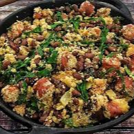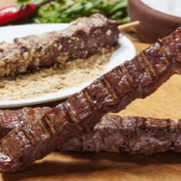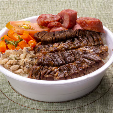 Arroz branco, feijão tropeiro, purê de batatas, banana frita, churrasco bovino e linguiça suína, saladas variadas.