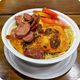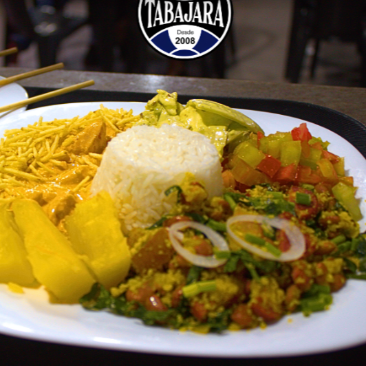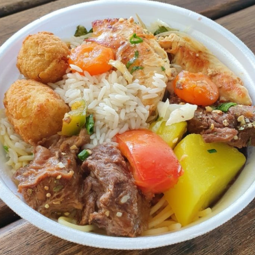 Arroz branco, feijão de caldo, macarrão, verdura do dia, farofa da casa, linguiça suína e frango assado, saladas variadas,