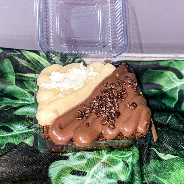 Massa de chocolate com cobertura de brigadeiro ao leite e brigadeiro de ninho.