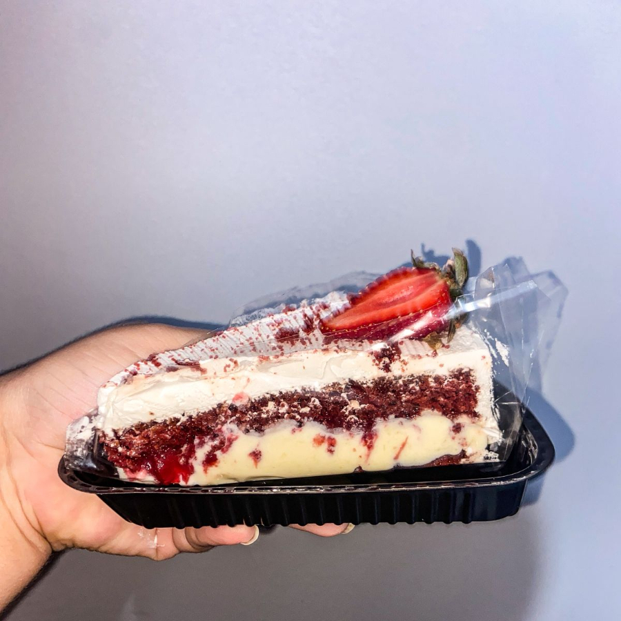 Fatia macia com creme de Ninho e geleia de morango, finalizada com morango fresco. Irresistível!