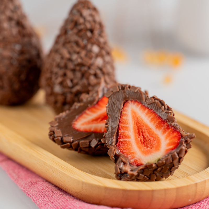Nosso delicioso brigadeiro belga ao leite envolvido no morango fresquinho, o doce perfeito.