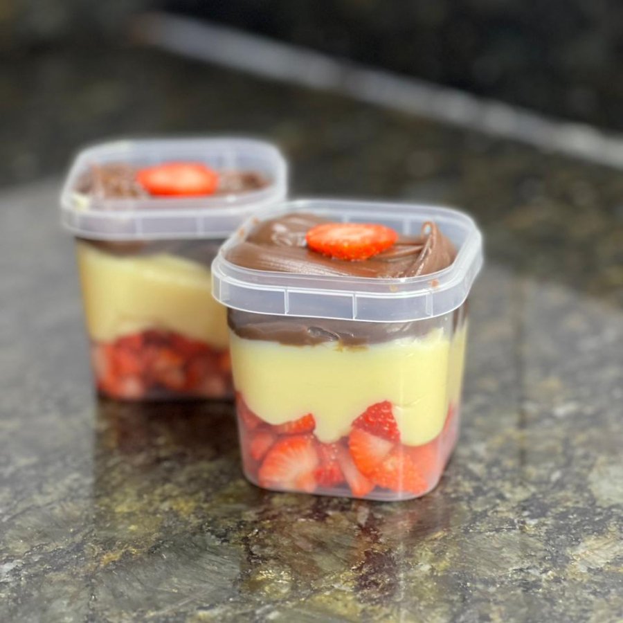 Morangos frescos, brigadeiro de ninho e brigadeiro belga ao leite.
