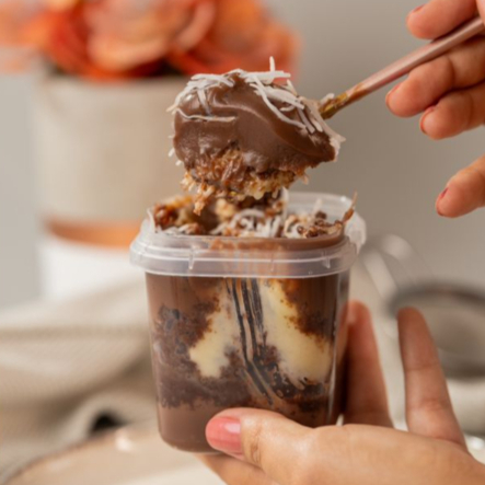 Copo da Felicidade de Brownie com Morangos, uma unidade de 330ml repleta de sabor e alegria. Este apetitoso copo é meticulosamente preenchido com um suave recheio de leite Ninho, envolto em um luxuoso chocolate belga ao leite. No coração deste copo, você encontrará pedaços do mais requintado brownie que já provou.