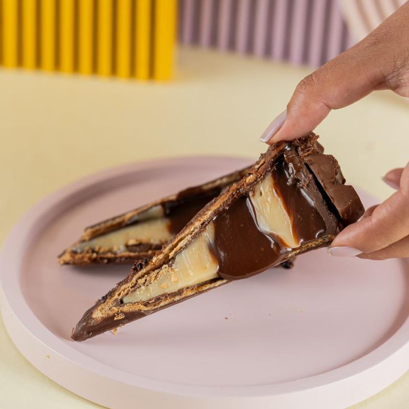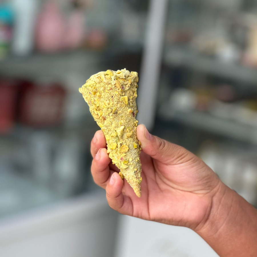 Uma casquinha crocante com chocolate branco e recheado com pistache.