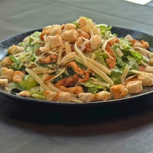 Alface americana, com pedaços de file de frango, parmesão ralado, crótons, e nosso delicioso molho caeser (receita da casa).
