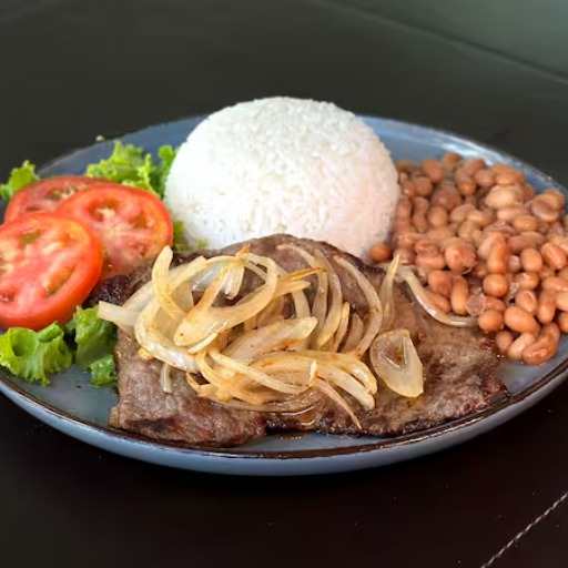 Suculento Bife de Coxão Duro finalizado com cebola, arroz, feijão de caldo e salada (alface e tomate)