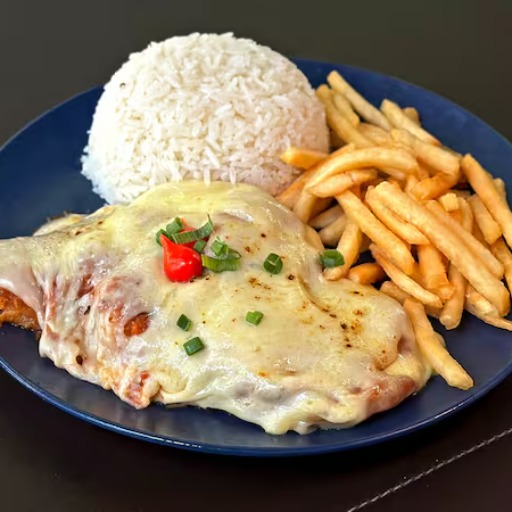 Delicioso file de frango a parmegiana, coberto com molho sugo artesanal e mussarela derretida! Acompanha arroz e batata frita!