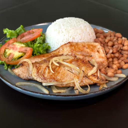 File de frango grelhado finalizado com cebola, arroz, feijão de caldo e salada (alface e tomate)
