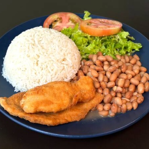 File de frango empanado na farinha, arroz, feijão de caldo e salada (alface e tomate)