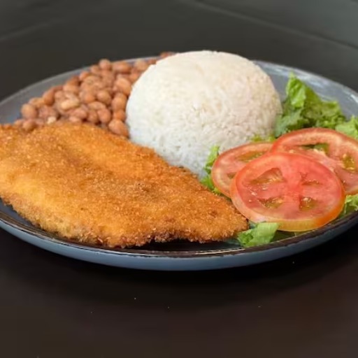 File de Tilápia empanada na farinha Panko, arroz, feijão de caldo e salada (alface e tomate)