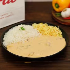 Cubinhos de filé mignon macios preparados em um molho cremoso e um toque de tempero caseiro. Acompanha arroz branco soltinho e batata palha crocante.