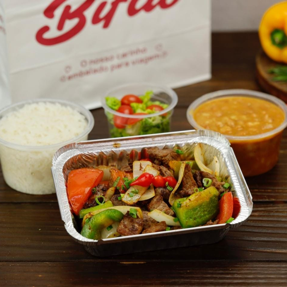 Coxão duro cortado em tiras suculentas, salteado na margarina com alho, cebola douradinha e pimentão verde. Servido com arroz branco soltinho, feijão de caldo bem e uma mini salada fresca.