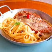Massa talharim al dente servida com suculento frango empanado, coberto com molho de tomate artesanal e queijo derretido gratinado e douradinho.