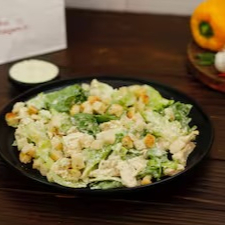 Folhas de alface americana com tiras de frango grelhado, lascas de parmesão, croutons douradinhos e o clássico molho Caesar cremoso.