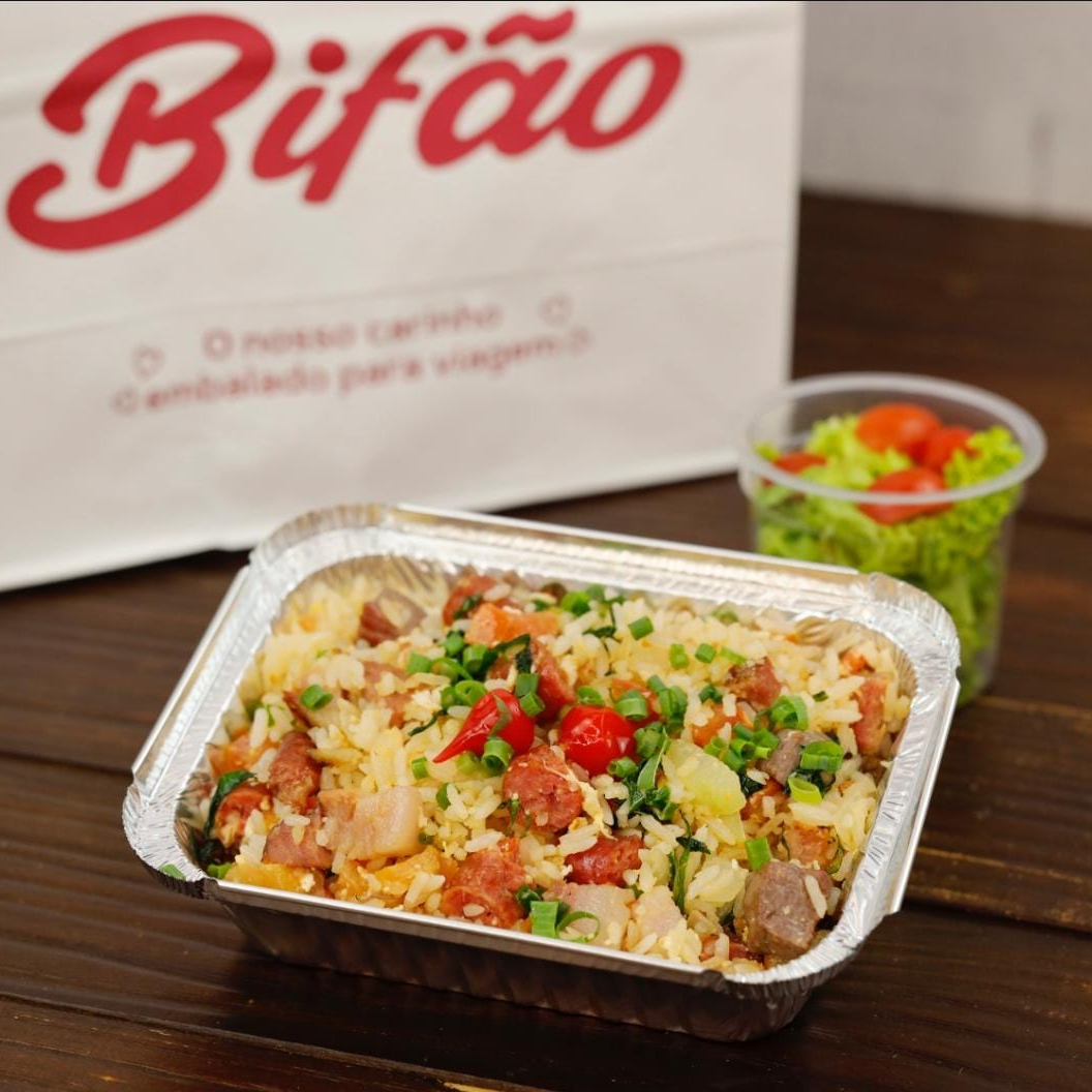 Arroz carreteiro preparado com linguiça suína dourada na margarina, carne de sol desfiada e bacon crocante, finalizado com couve refogada.