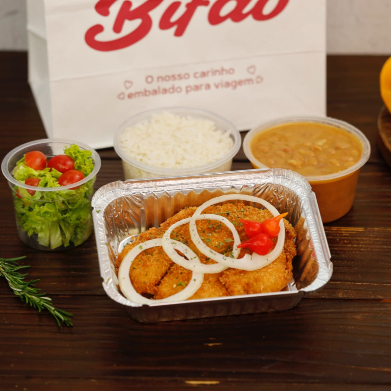 Filé de frango empanado e frito servido com arroz branco soltinho, feijão de caldo bem temperado e uma mini saladinha fresca.