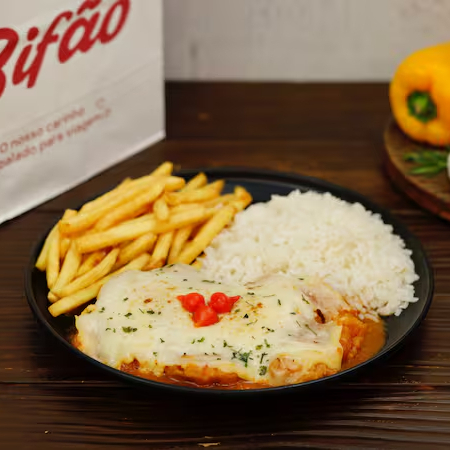 Filé de frango empanado e frito, coberto com molho de tomate artesanal e uma camada generosa de muçarela derretida e gratinada. Acompanha arroz branco soltinho e batata frita crocante.