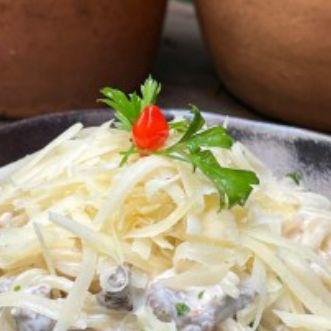 Muito, mas muito saboroso purê de mandioca feito com manteiga de leite e creme de leite, carne seca feita aqui mesmo e gratinado com queijo mussarela em cima. Muuuito bom!