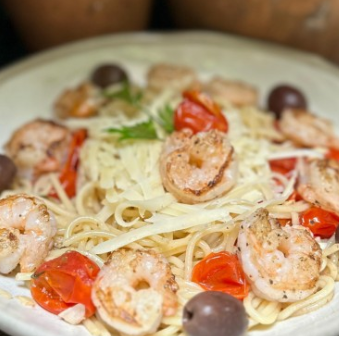 Camarão salteados no azeite e reduzidos no vinho branco deitados em uma cama de espaguete feitos com confit de tomate cereja, alho e manjericão, finalizados com parmesão e azeitonas pretas. Muito mais barato que ir pra Mykonos comer! Kkk