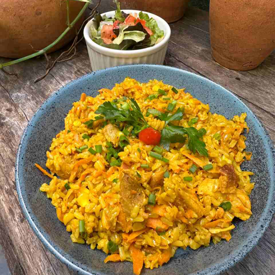 Galinhada feita no capricho com arroz integral e acompanha uma saladinha com molho da vovó. peso 300g.