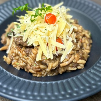 Cubinhos de filé mignon e mix de cogumelos puxados na manteiga com aquele arroz arbóreo bem cremoso e finalizado com parmesão.