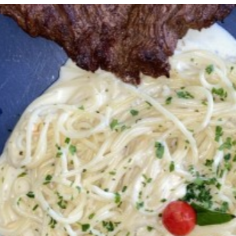 Delicioso espaguete, ao molho dos queijos: gorgonzola, provolone, requeijão cremoso e parmesão, e para harmonizar um filé mignon fantástico...muuuito bom!