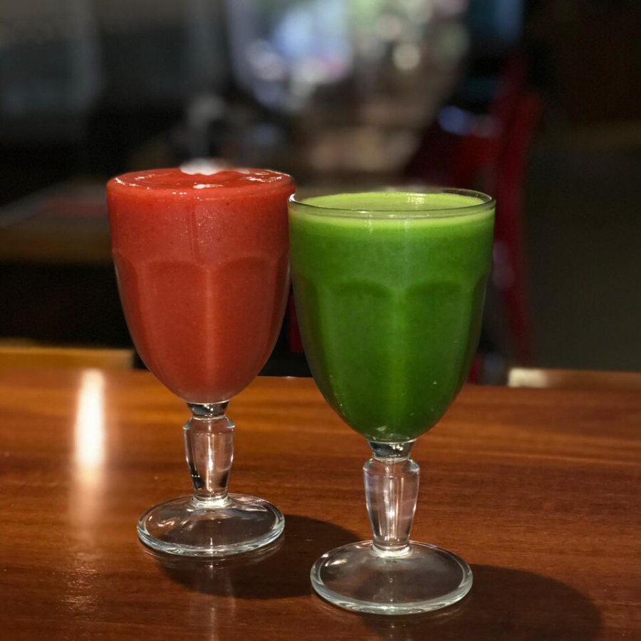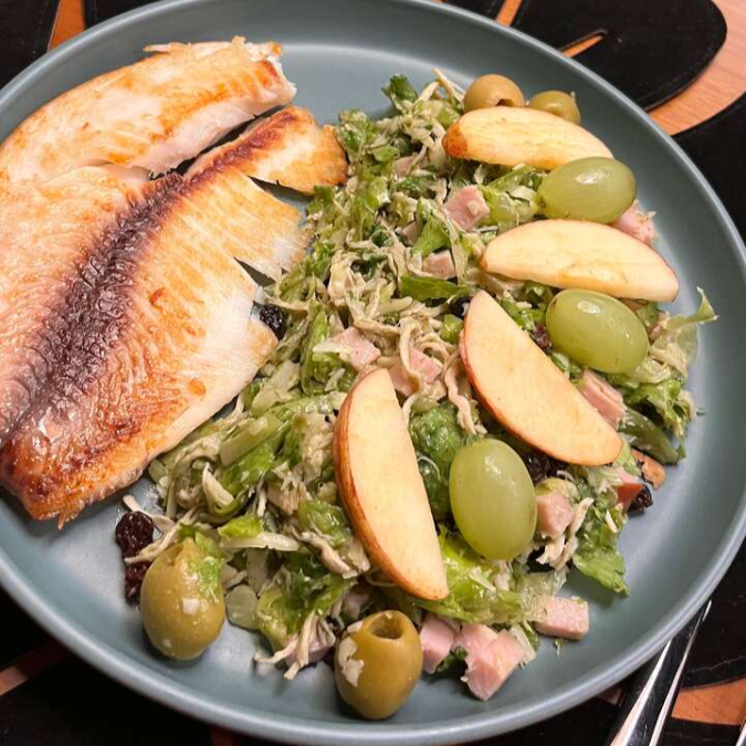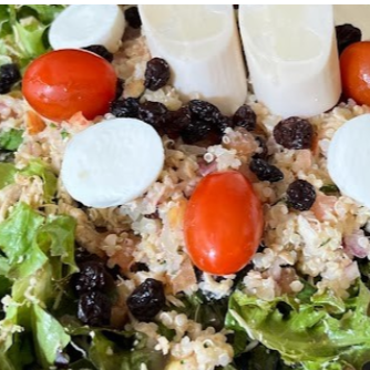 Delicioso e refrescante tabule de quinoa com frango desfiado, maçã verde, uva passas, e tomate cereja, acompanhado de uma salada verde com muçarela de búfala, palmito e molho pesto.