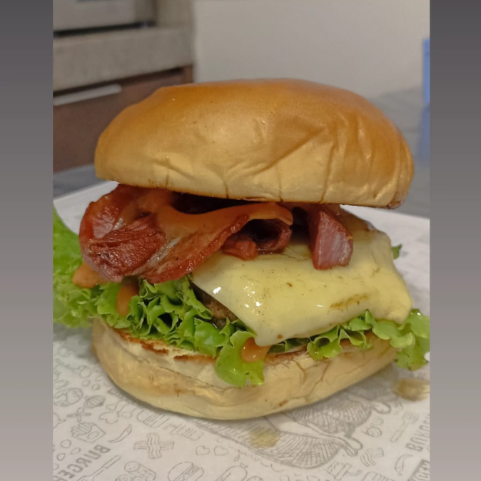Pão de brioche, hambúrguer 160 gr, tiras de bacon, queijo mussarela, alface e molhoespecial.