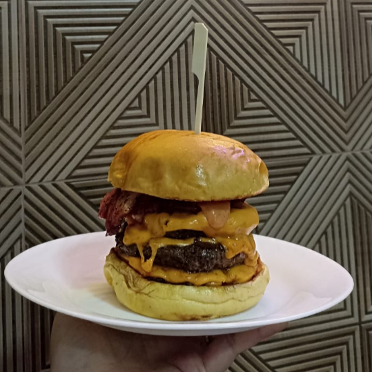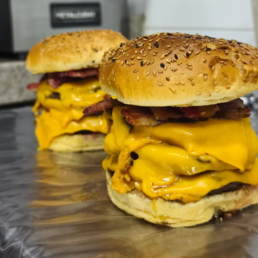 Pão de brioche, 3 hambúrgueres 160 gr, tiras de bacon,3 queijo cheddar, e molho especial.