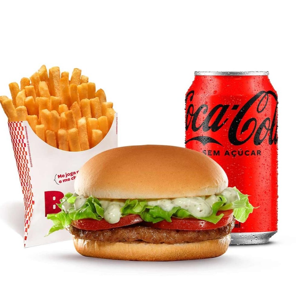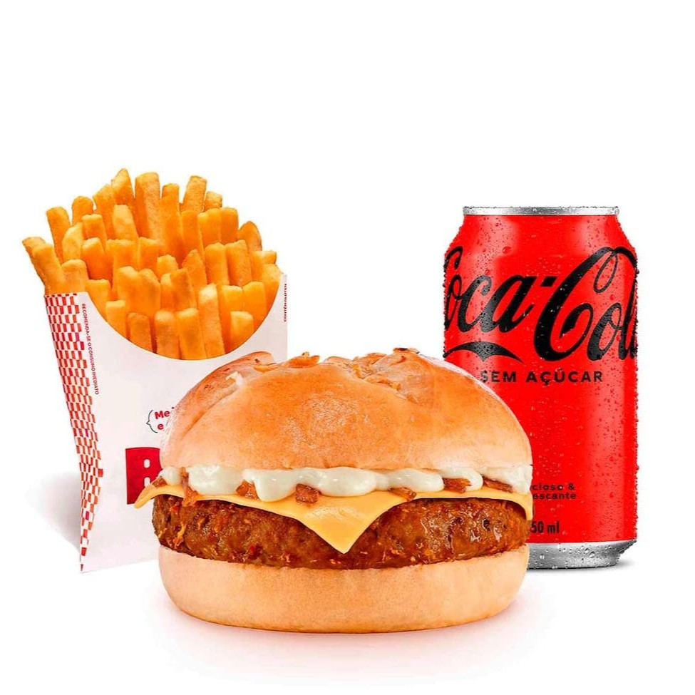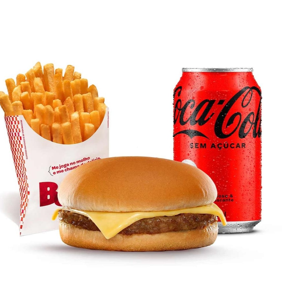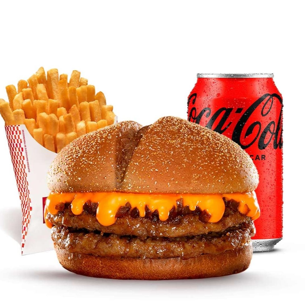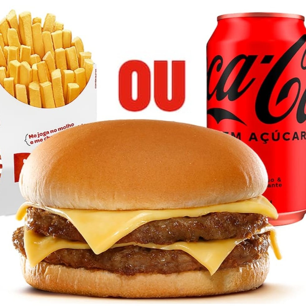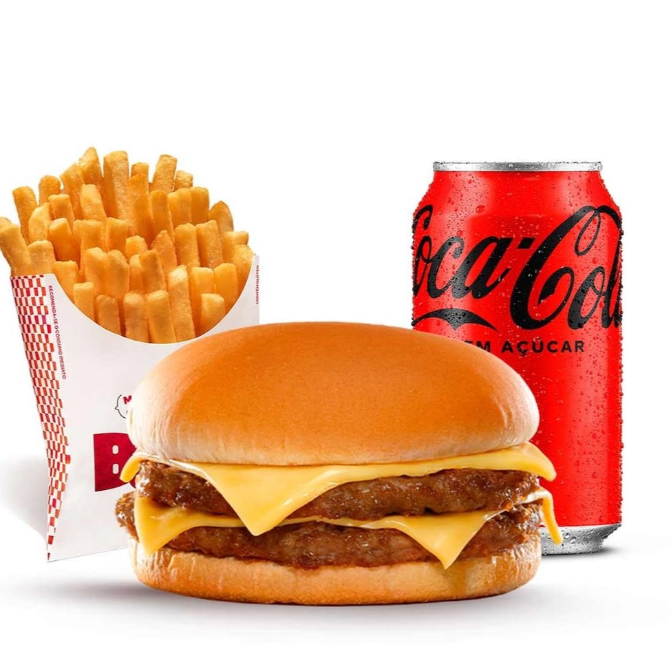 Clássico que todo mundo gosta: dois hambúrgueres bovinos com queijo num pão quentinho. Tudo isso acompanhado de refrigerante e batata quentinha.