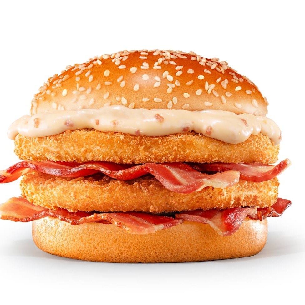 Dois suculentos empanados de frango, super crocante, maionese sabor bacon, o dobro de fatias de bacon, em um pão brioche quentinho. Um baconzudo de responsa!