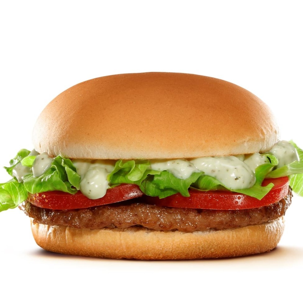 Pão quentinho, alface e tomate fresquinhos, hambúrguer bovino e maionese de ervas.