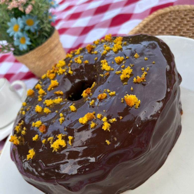 Delicioso bolo de cenoura caseiro com uma generosa cobertura de chocolate ao leite.