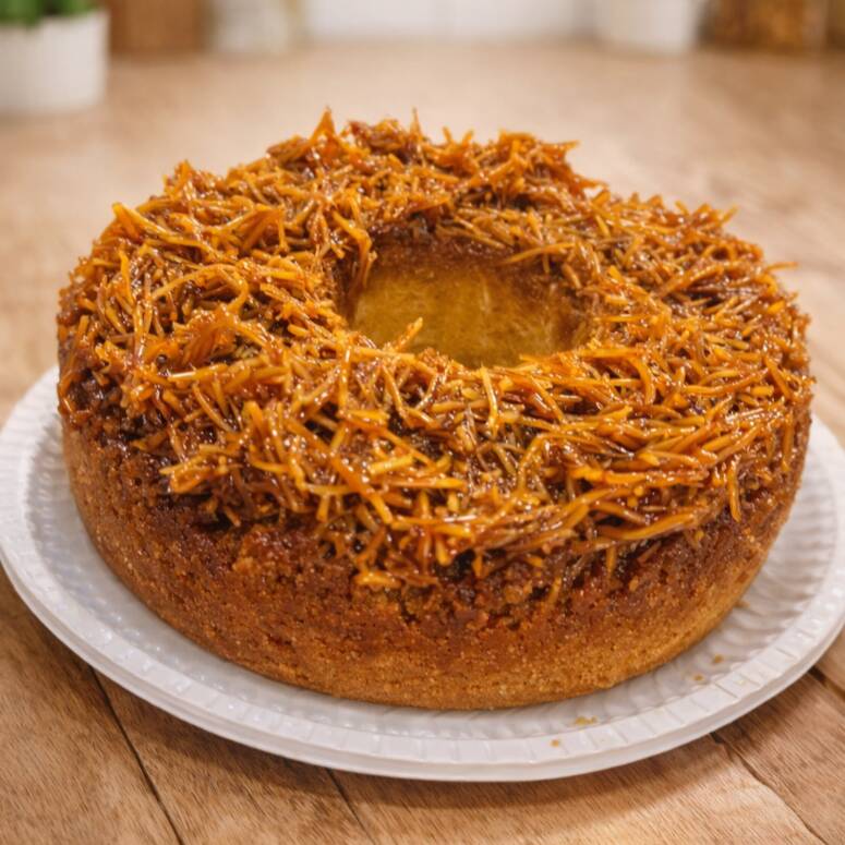 Bolo preparado na massa de trigo, com um toque especial de cocada caramelizada encima.