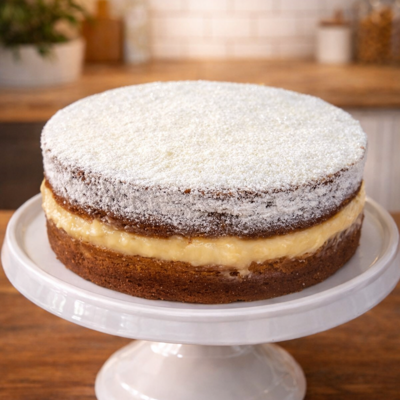 Massa de iogurte, recheado com creme de confeiteiro e encima uma camada de açucar de confeiteiro e leite em pó, que dá um toque especial. Para quem não gosta de bolo doce, esse é simplesmente perfeito!