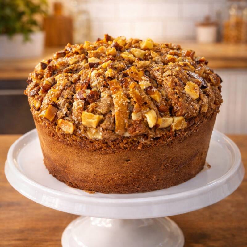Bolo feito em uma massa leve, com pedaços de maça e por cima um camada crocante de maça, castanhas e açucar.