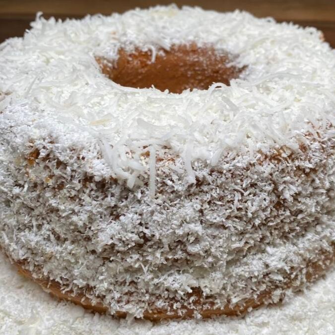 Delicioso bolo gelado, fofinho com coco. Bolo Tam:M
