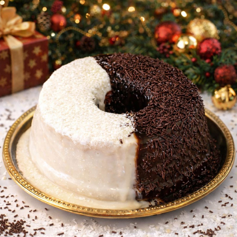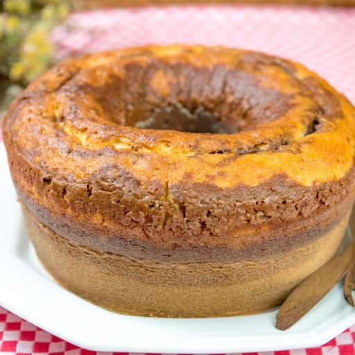Dois sabores: massa de trigo e chocolate. Conhecido também como bolo mármore.