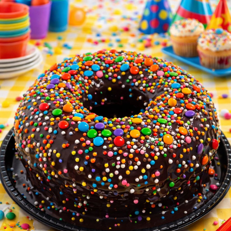 Bolo de chocolate com cobertura por cima e confetes coloridos de chocolate