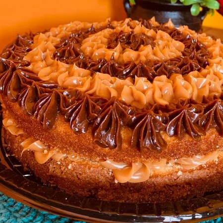 Bolo de Churros, recheado e decorado com doce de leite e chocolate. com um toque especial de canela na massa