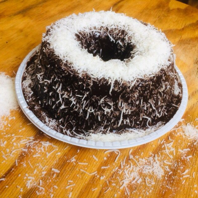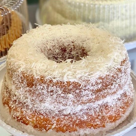 Bolo feito com leite de coco e coco ralado, bolo molhado, muito saboroso, peso :1,5 kg já vai na embalagem. Serve mais de 6 pessoas.