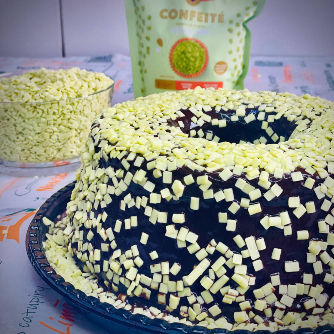 Bolo de Chocolate meio amargo, molhado na calda de Pistache, e coberto com nossa maravilhosa cobertura de chocolate e decorado com Pistache por cima do Bolo .