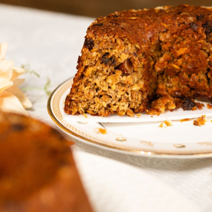 Bolo feito com aveia e granola, adoçado com banana. Possui castanha do pará, uva passas e Damasco. Simplesmente delicioso e nada de açúcar!!!