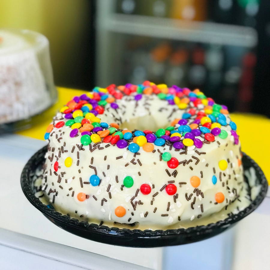 Bolo de formigueiro com cobertura de leite ninho e confeitado com confetes coloridos.