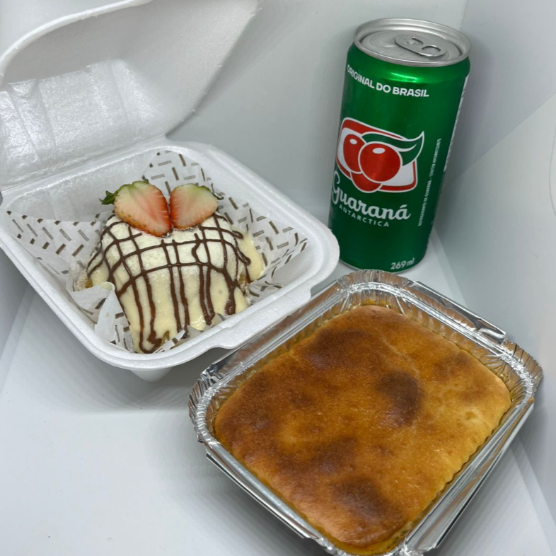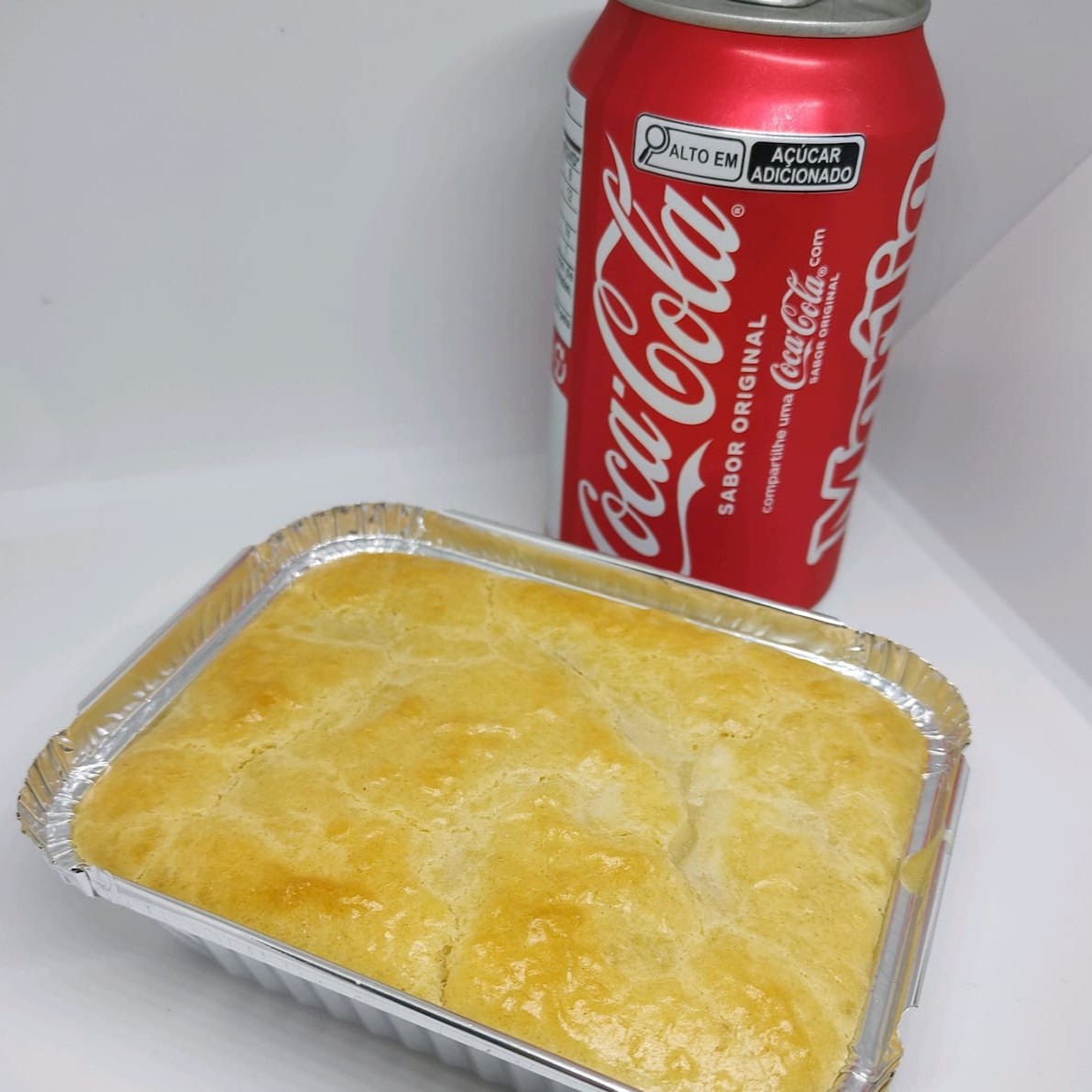 1 Torta de Frango com Catupiry + Bolo Gelado (Escolha o sabor) + Refrigerante Guaraná 269ml ou Coca-cola 220ml Lata Mini. Obs: **Serve 1 Pessoa** Embalagem De 220ml>> Peso 165g Aprox.