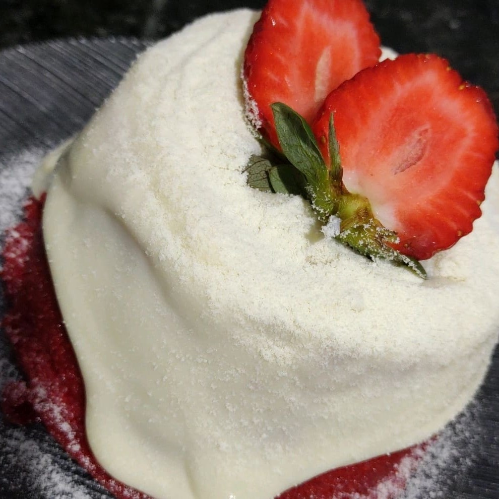 Bolo Mini vulcão caseirinho, massa redvelvet fofinha, coberto com recheio de ninho, ninho polvilhado. Uma explosão de sabor! Obs: Tamanho 12cm, Serve 1 Pessoa!