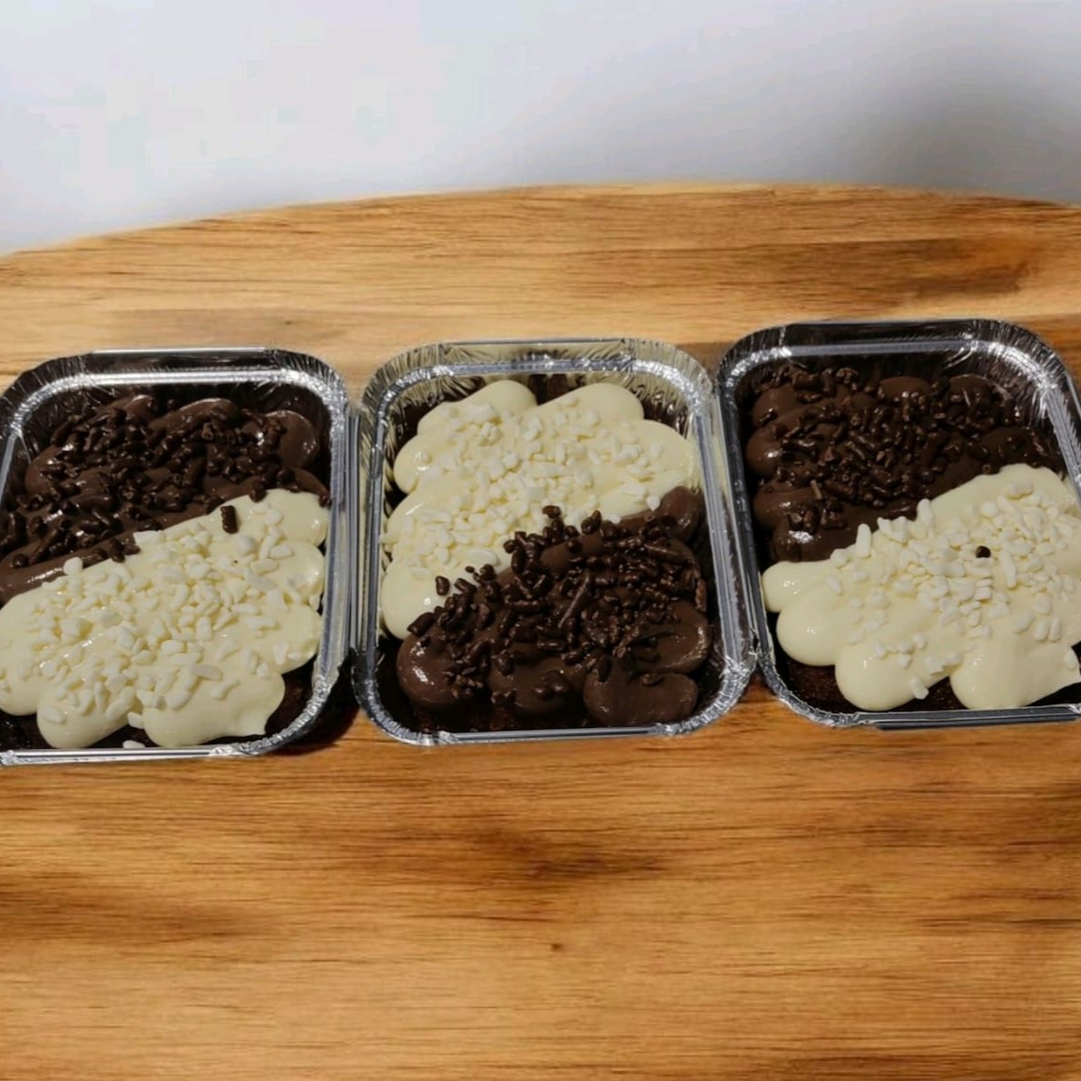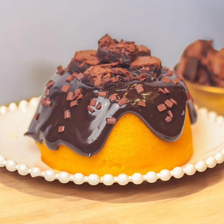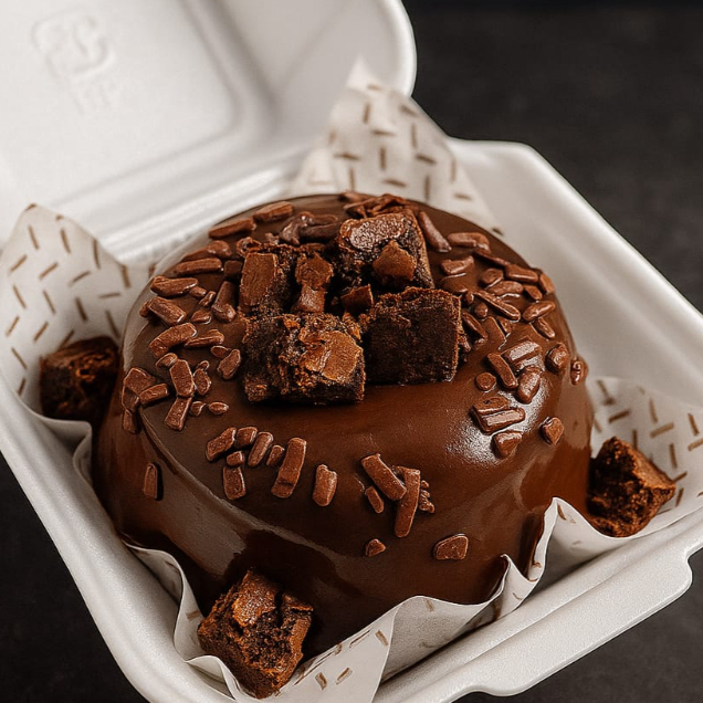 Massa de chocolate recheado no centro com brigadeiro, finalizado com cobertura de brigadeiro artesanal cremoso e quentinho com pedaços de brownie. Uma explosão de sabor para os amantes em chocolate! Obs: Tamanho 9cm, Serve 1 Pessoa!